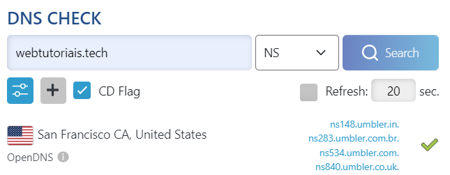 É essencial criar o registro de DNS do tipo A e CNAME no lugar correto, para que o redirecionamento para o Mercado Shops funcione corretamente. Sendo assim, antes de começar, vamos confirmar os servidores de nomes (NS) que seu domínio está utilizando. Para isso, acesse sites como DNS Checker ou What's My DNS, insira seu domínio, selecione a opção "NS" (Nomes de servidores) e consulte.