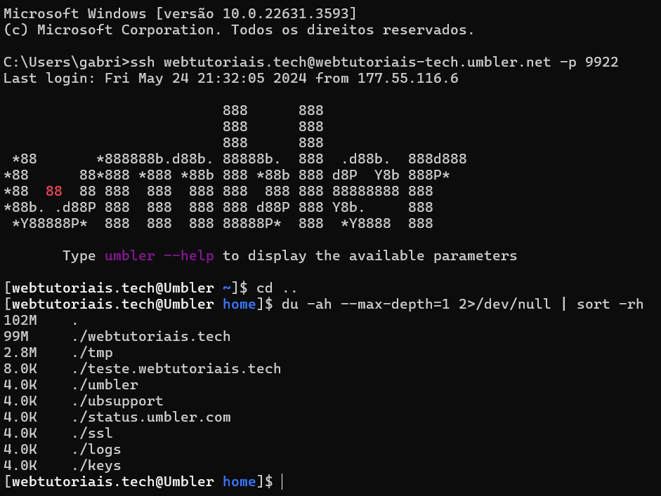 Para acessar seu servidor e consultar o tamanho dos sites via SSH, siga nosso tutorial de configuração e acesso SSH . Depois de configurado o SSH, você pode usar comandos como du (disk usage) para verificar o uso de espaço em disco de cada site hospedado no seu servidor. Esses comandos permitem uma análise detalhada e rápida diretamente no terminal.