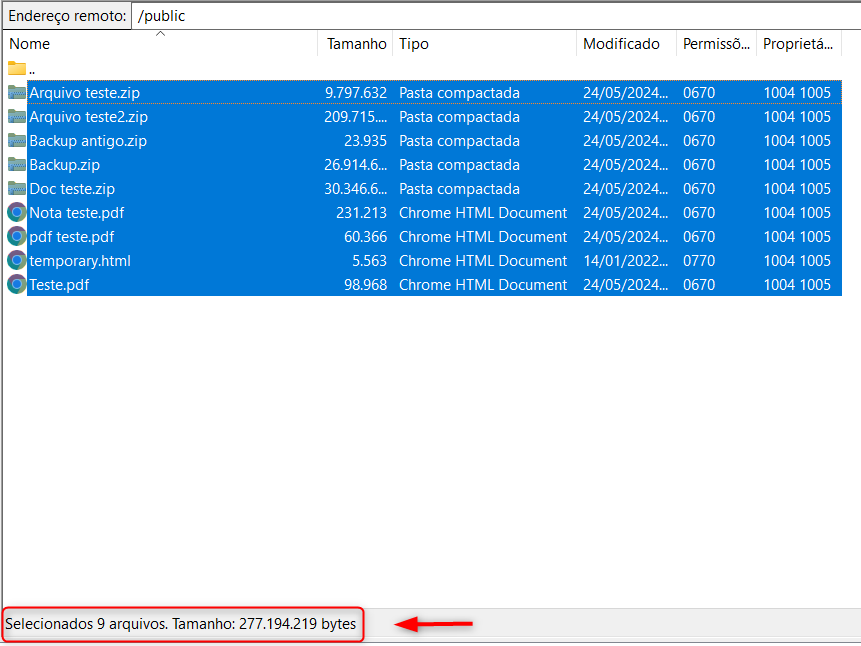 2) Verifique o Tamanho dos Arquivos: Ao selecionar os arquivos na lista do FileZilla, você pode visualizar o tamanho total dos arquivos selecionados na parte inferior da janela do FileZilla. Isso permite que você veja rapidamente o tamanho total dos arquivos em uma determinada.