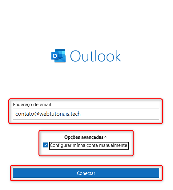 Insira seu e-mail, clique em "Opções Avançadas" e marque a caixa "Configurar minha conta manualmente". Em seguida, clique em "Conectar".