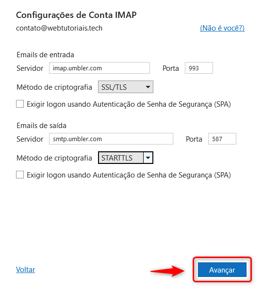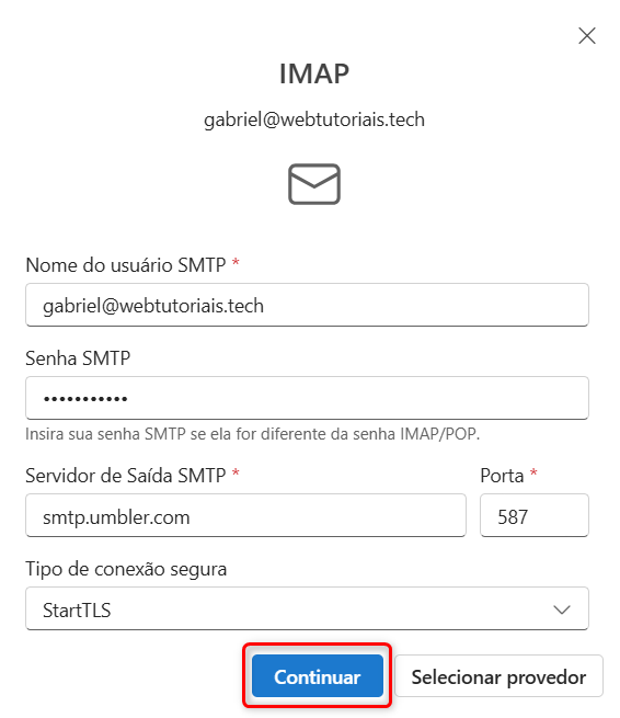 Servidor de saída SMTP: smtp.umbler.com / Porta: 587