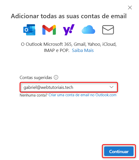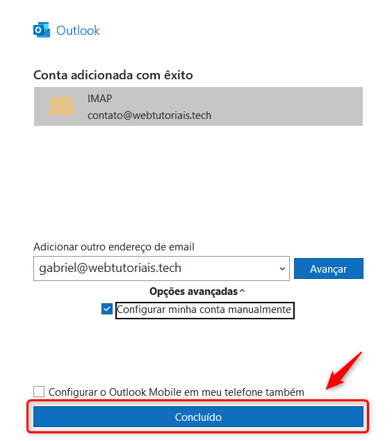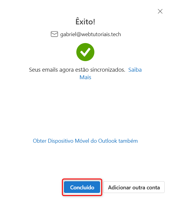 Com isso, seu e-mail foi adicionado com sucesso ao Outlook. Por fim, clique em "Concluído".