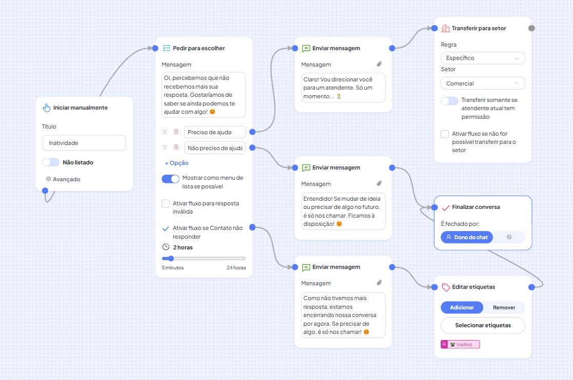 Por fim, veja como configurar o tempo de inatividade e associar o fluxo de 'Inatividade' criado acima. Neste exemplo, estamos definindo que, após 2 horas sem resposta do contato, o fluxo de inatividade será ativado automaticamente. Assim, sempre que a conversa permanecer inativa por esse período, o fluxo criado entrará em ação.