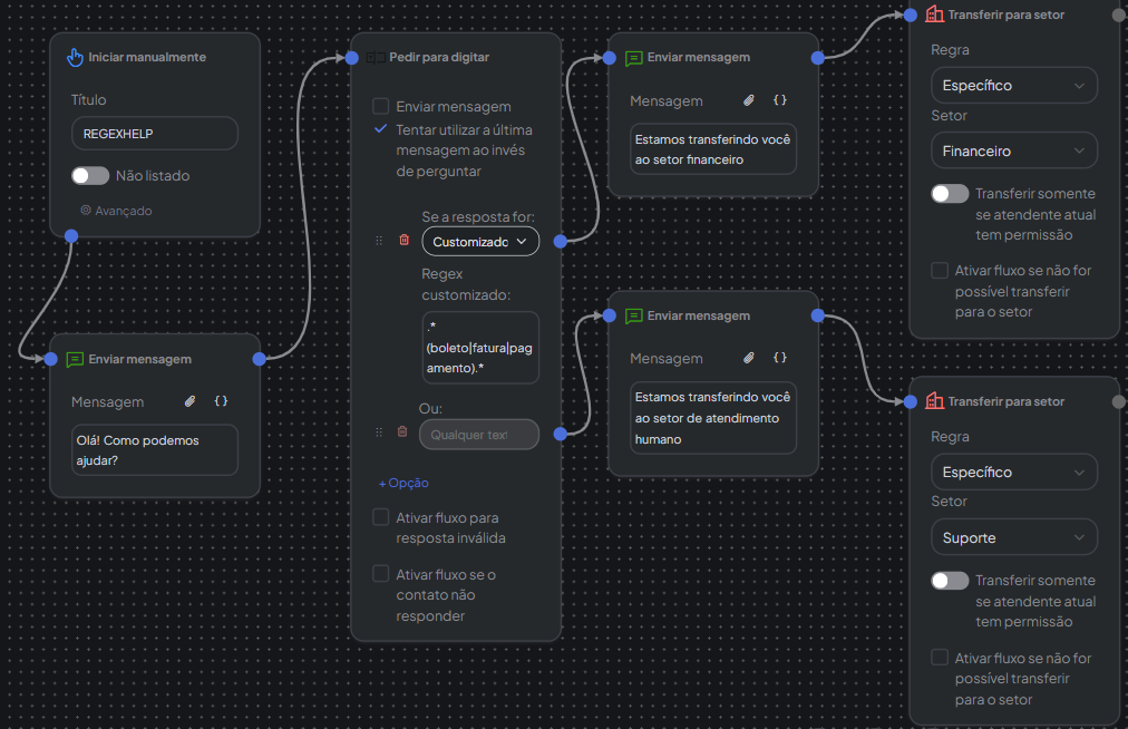 Essa regex irá capturar qualquer uma dessas palavras. Ou seja, se o cliente disser "Eu preciso pagar minha fatura" ou "Tenho um boleto para pagar", o fluxo será automaticamente direcionado para o setor financeiro.