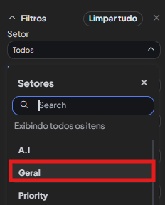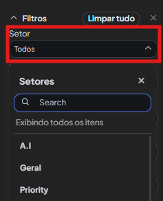 Na barra lateral de filtragem, clique no botão seletor ''Setor''