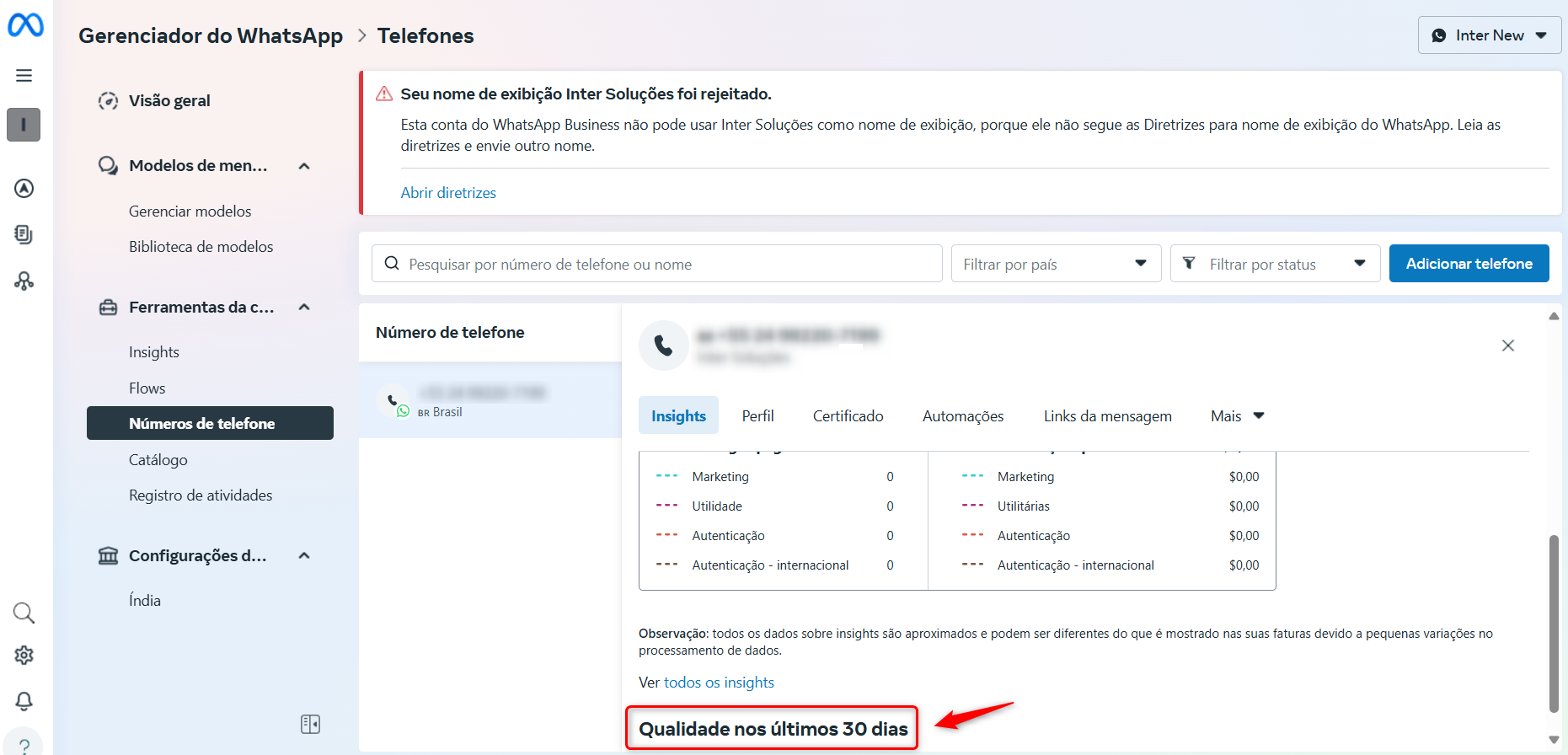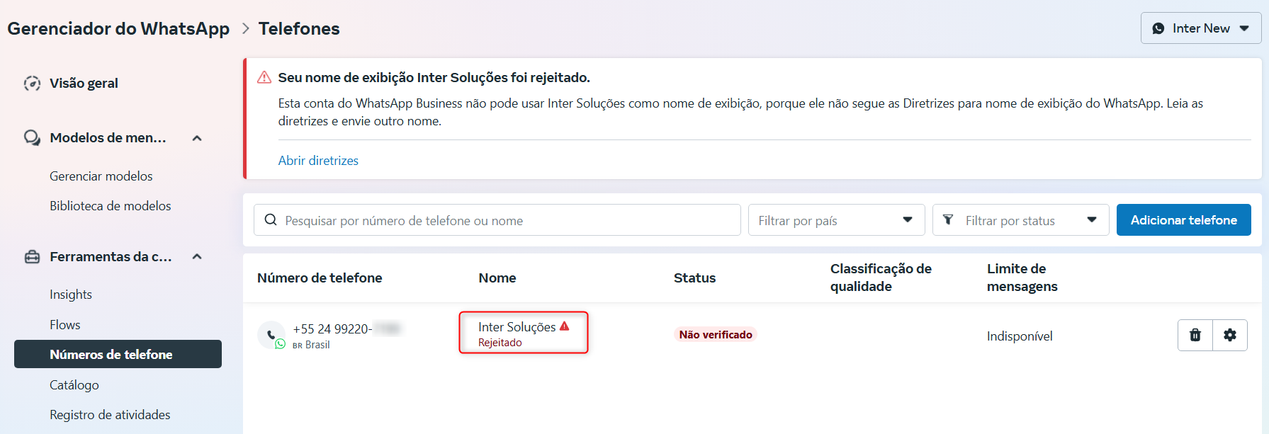 O nome da empresa precisa estar aprovado e visível no perfil do número. Sem isso, o número não é considerado "pronto para uso oficial". Você pode confirmar o nome de exibição aprovado e ativo acessando o Gerenciador do WhatsApp Business no Facebook Business Manager, em: https://business.facebook.com/wa/manage/phone-numbers. No exemplo a seguir, o nome de exibição está com "Rejeitado".
