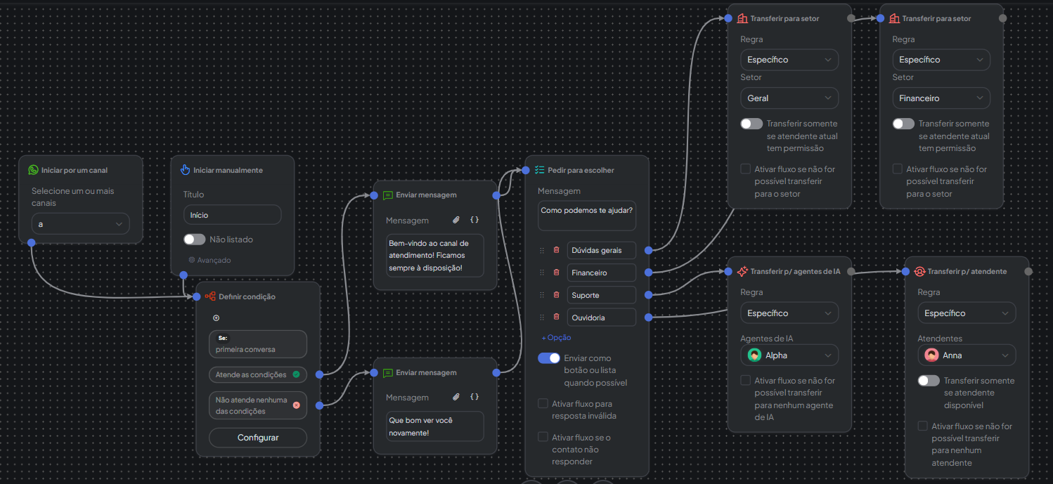 A criação do fluxo depende diretamente do objetivo do seu chatbot. Antes de começar, é importante definir claramente qual será a função dele: atendimento inicial, direcionamento de setores, suporte técnico, vendas, entre outros.