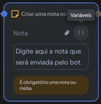 Assim como no bloco de envio de mensagem, é possível digitar livremente o texto da nota e utilizar variáveis para tornar o conteúdo dinâmico.