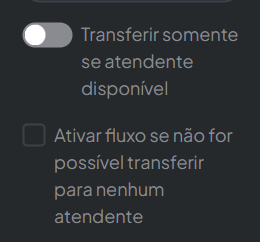 Além disso, existe a opção Ativar fluxo se não for possível transferir para nenhum atendente. Ao habilitar essa opção, o chatbot continuará a execução do fluxo configurado caso não haja atendentes disponíveis ou elegíveis para receber a conversa.