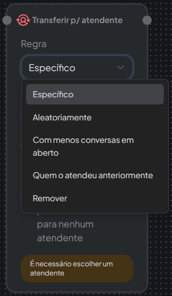 O bloco também conta com a opção Transferir somente se o atendente estiver disponível. Quando ativada, a transferência só será realizada caso o atendente selecionado ou sorteado esteja com status disponível no sistema.