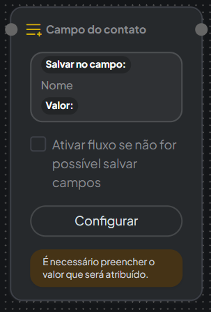 O bloco Campo do contato permite definir ou atualizar valores em campos específicos do contato, como nome, e-mail ou telefone, de acordo com os campos disponíveis na sua conta.