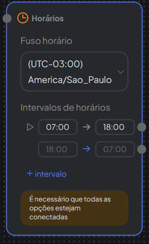 O bloco Horários permite definir ações específicas dentro do fluxo com base no horário em que o contato está interagindo com o chatbot.