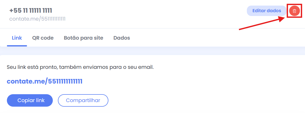 Nessa página você verá alguns detalhes sobre o seu link e poderá clicar no ícone de lixeira, destacado abaixo, para realizar a exclusão do seu link: