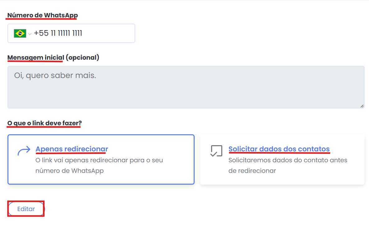 - Mensagem inicial: A mensagem que será encaminhada ao número assim que acessarem o seu link para redirecionamento;