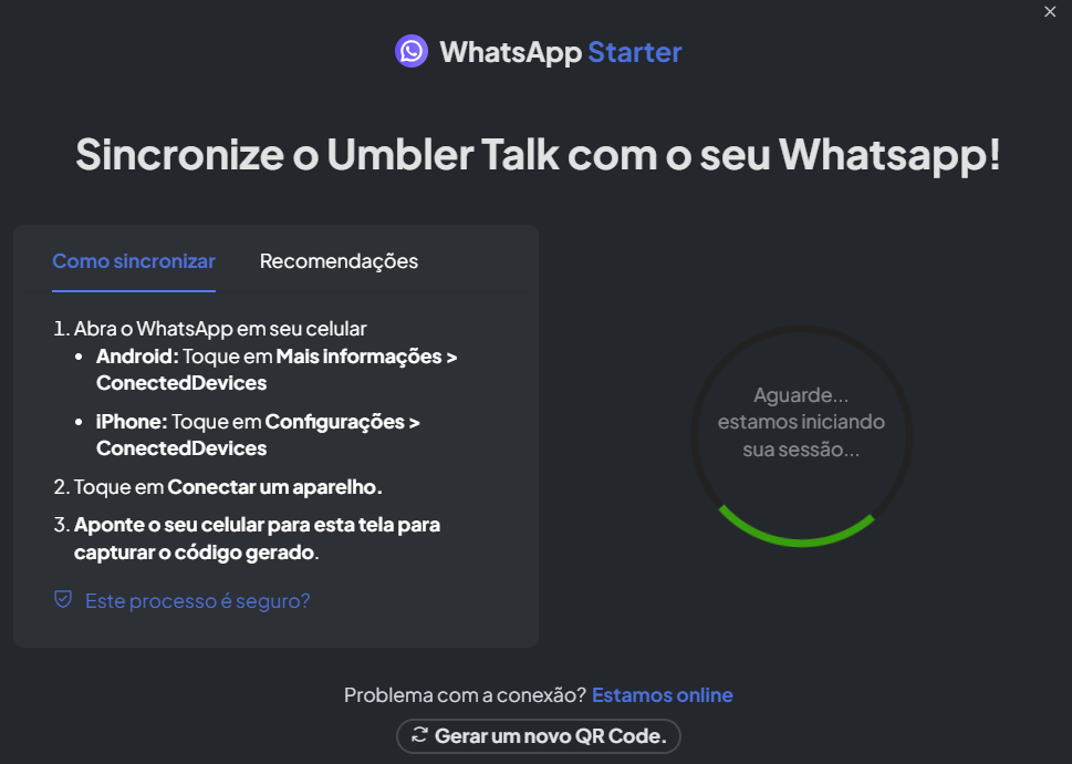 Caso o seu canal esteja "offline", clique em "Sincronizar" para realizar a leitura do QR code novamente.